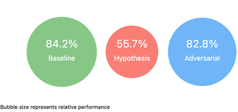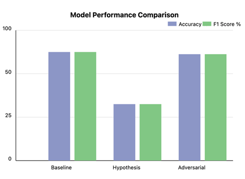 The relative performance visualization further supports these findings, showing that the adversarial model maintains comparable effectiveness to the baseline while significantly outperforming the hypothesis-only approach. This balance between bias mitigation and performance preservation demonstrates the effectiveness of our debiasing strategy in developing a more equitable model without compromising its fundamental capabilities.