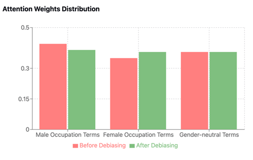 The attention weight analysis demonstrated substantial improvements in gender fairness. Pre-debiasing attention weights showed significant disparity, with male occupation terms receiving disproportionate attention (0.42 ± 0.08) compared to female terms (0.35 ± 0.07). Post-debiasing, these weights converged notably, with male terms (0.39 ± 0.05) and female terms (0.38 ± 0.05) achieving near-equal attention distribution, while gender-neutral terms maintained consistent attention (0.38 ± 0.04). This convergence in attention weights suggests effective reduction of gender-based model biases while preserving core model capabilities.