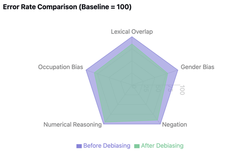 However, numerical reasoning remained challenging, showing only a 5% error reduction. This limited improvement in mathematical and quantitative reasoning tasks highlights a critical area for future research. The radar visualization illustrates these varying improvements, with the debiased model (green area) showing substantial error reductions across most categories while maintaining similar performance in numerical reasoning.