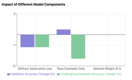 Our ablation studies revealed crucial insights into the relative importance of different components in our model architecture. The removal of the adversarial loss component resulted in a significant performance decrease, with accuracy dropping by 1.2%, demonstrating its critical role in bias reduction while maintaining model performance. Interestingly, when we modified the training approach to focus exclusively on easy-to-learn examples, we observed a modest improvement of 0.5% in validation set accuracy. However, this came at a substantial cost, as performance on challenging examples decreased by 2.3%, highlighting the essential role that difficult and ambiguous examples play in developing robust model generalization capabilities. Through careful experimentation with different adversarial loss weights, we determined that a weight of 0.1 provided the optimal balance between maintaining task performance and achieving effective bias reduction. This finding suggests that while the adversarial component is crucial, its influence needs to be carefully calibrated to avoid overwhelming the primary training objective. The accompanying visualization illustrates these trade-offs, clearly showing how different architectural choices impact both standard validation performance and the model’s ability to handle challenging cases.