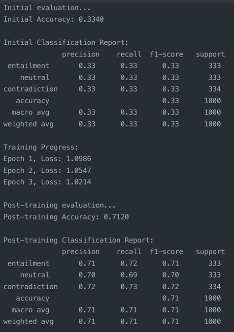 - NLIDataset Class: Handles data preprocessing and tokenization for premise-hypothesis pairs